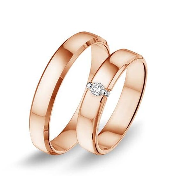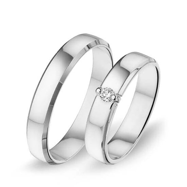 Lichtbolle trouwring met schuine kanten en een enkele draadzetting van witgoud. Hierin is een 0,05ct briljant gezet. Zeer elegant. 4mm breed.