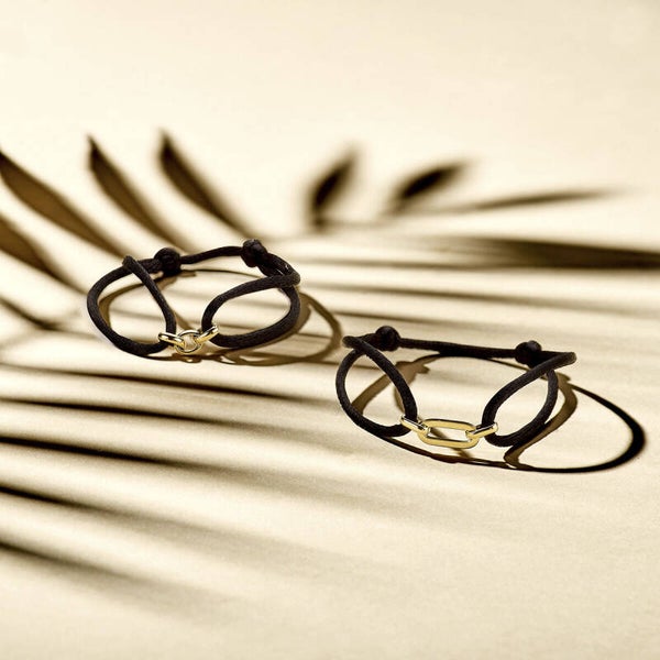 Zwart gevlochten armband uitgevoerd met een 14k geelgouden schakel van 6mm. De armband heeft draaglengtes van 13 tot 26cm.