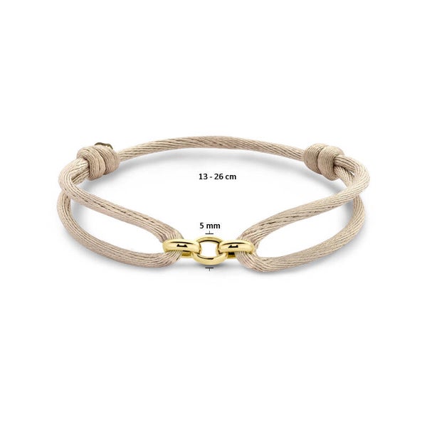 Beige gevlochten armband uitgevoerd met drie in elkaar 14k geelgouden ringetjes met een diameter van 5mm. De armband heeft draaglengtes van 13 tot 26cm.