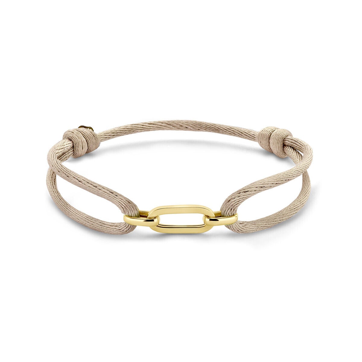 Beige gevlochten armband uitgevoerd met 14k geelgouden element. De armband heeft draaglengtes van 13 tot 26cm. Het element heeft een breedte van 6mm.