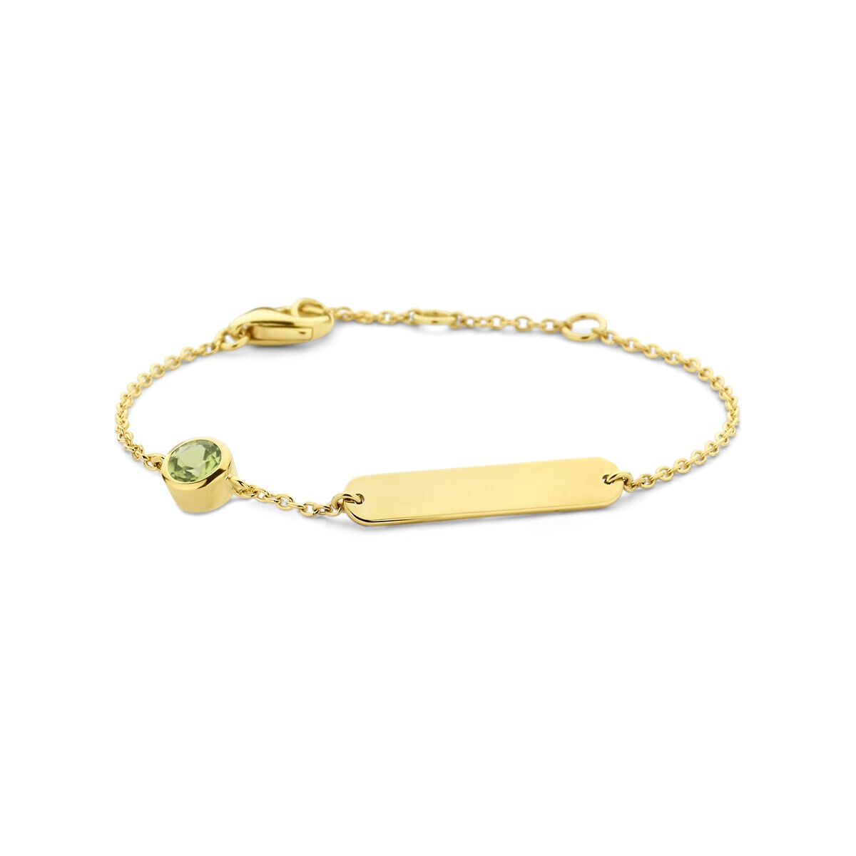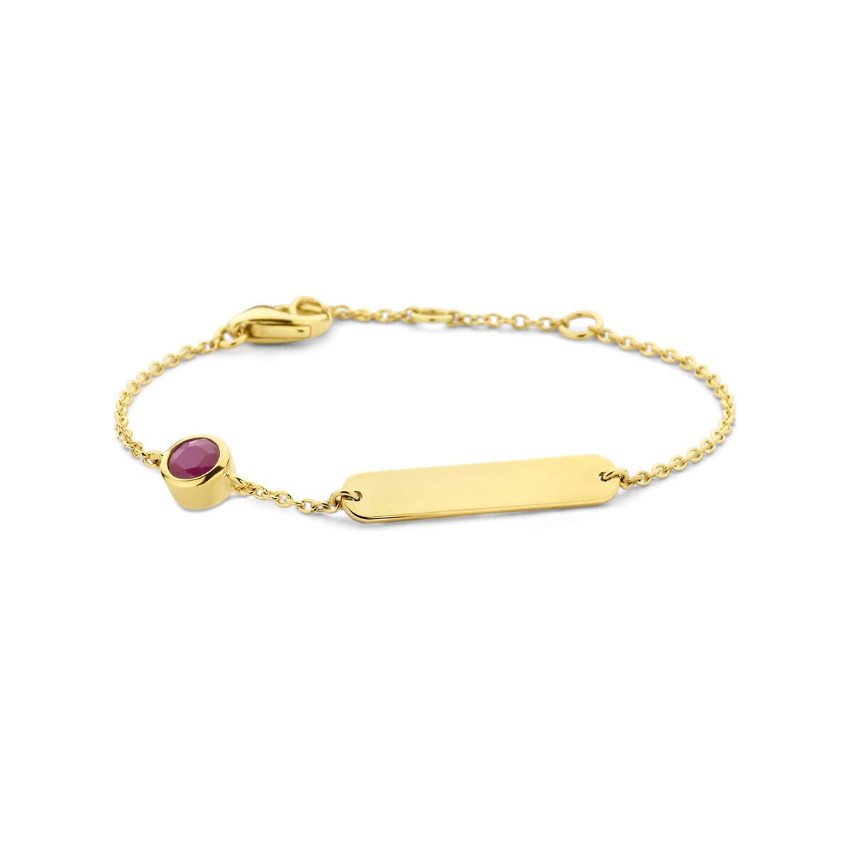 14k Geelgouden graveerarmband uitgevoerd met een schitterende kleursteen. De armband heeft draaglengtes van 11-12-13cm. De schakelbreedte is 1.2mm. De graveerplaat heeft een afmeting van 4x20mm en een dikte van 0.8mm.